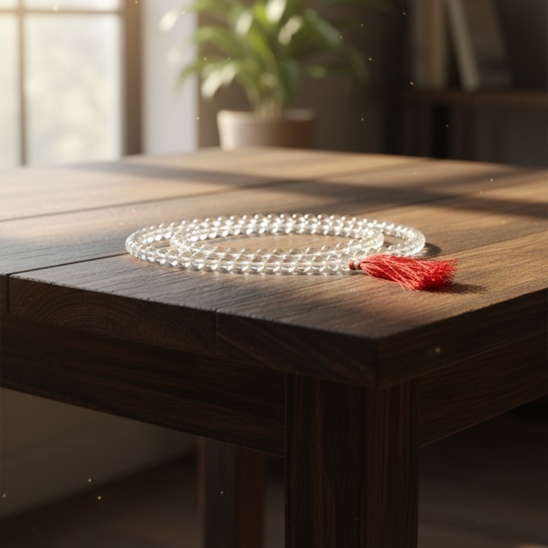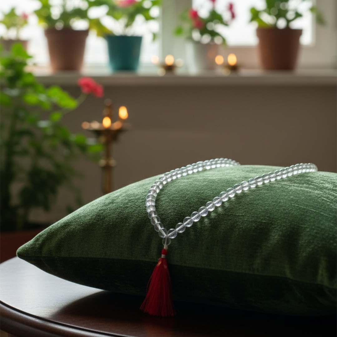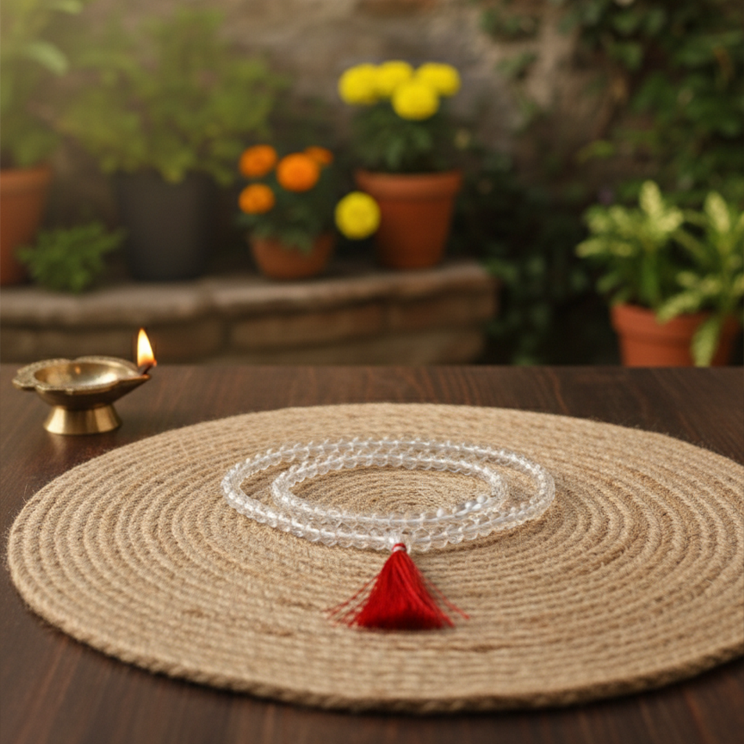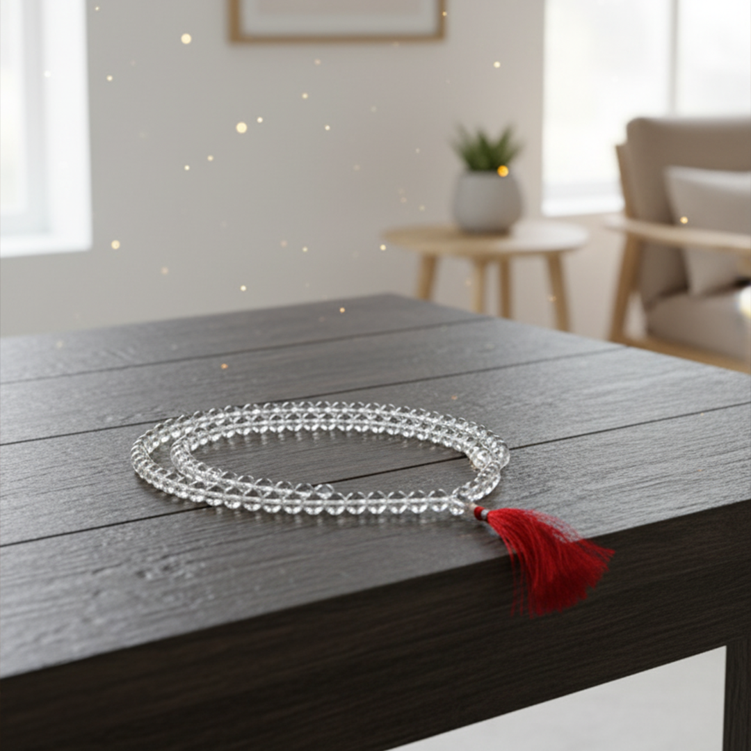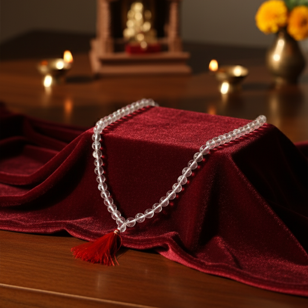 A Sphatik Mala (Clear Quartz Rosary) is a sacred and powerful spiritual accessory made from natural crystal quartz. Known for its cooling energy and strong healing properties, it is widely used for meditation, mantra chanting, energy cleansing, and spiritual growth.